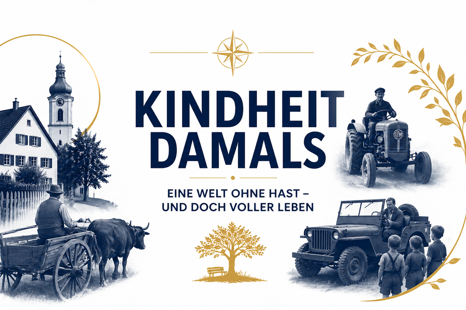 Als ich zehn Jahre alt war, war meine Umwelt nicht sehr verschieden von jener hundert Jahre vorher. Auf der unbefestigten Straße tummelten sich Hühner und Gänse. Kinder spielten ohne Gefährdung durch Autos. Die knarrenden Karren der Bauern wurden von gemächlichen Ochsen durchs Dorf gezogen. Manche dieser Fuhrwerke besaßen bereits Gummireifen- ein Inbegriff des Fortschritts. Nur selten tuckerte ein Einzylinder-Steyr-Traktor durchs Dorf, die blaue Puch 175 war der Stolz (und oft der Tod) der jungen Männer. Wenn der Doktor Radimsky selig mit seinem ehemaligen US-Armeejeep auftauchte, wurde er von der Kinderschar wie ein Weltwunder angestarrt.
