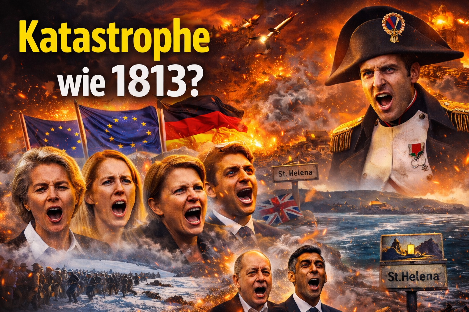 Als schrille Begleitmusik zu diesem weltweiten Konzert der Raketen, Drohnen und Bombenflugzeuge erschallt weithin das Kriegsgeschrei der EU- Vorkämpferinnen Leyen, Kallas und unserer Außenministerin Meinl- Reisinger. Die trotz schlimmster Erfahrungen wieder kriegslustigen Deutschen und die abgehalfterten Briten brüllen mit. Auch der Mini-Wiedergänger Napoleons, Emmanuel Macron, hat scheinbar vergessen, was dem einstigen Kaiser im Zuge seiner Mehrfrontenkriege widerfuhr: Spanien, Russland, Mitteleuropa, später ganz Europa nahm er aufs Korn. Die Folge: Katastrophe 1813 (Völkerschlacht bei Leipzig). Ende auf trostlosen Insel St. Helena, 1921.