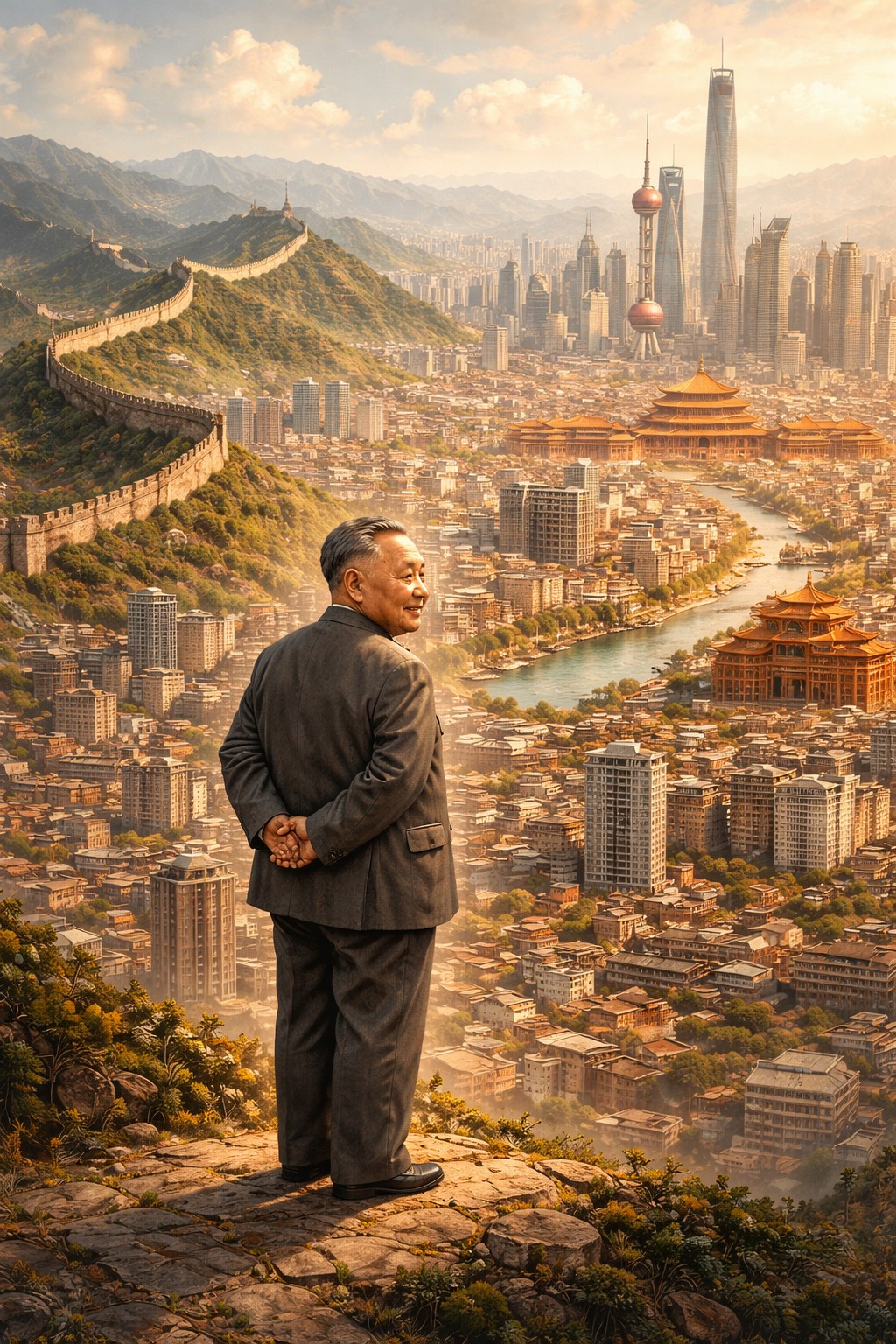 Der „Große Steuermann“ Deng, als Teenager Student in Frankreich, später Minister, Verbannter, dann wieder hoher Politiker in Beijing, maß lediglich 1,57 m. Nicht nur durch seinen Ausspruch: „Egal ob gelbe Katze oder schwarze Katze- solange sie Mäuse fängt, ist sie eine gute Katze.“ wurde er weltberühmt. Er schaffte es, das darniederliegende Riesenreich innerhalb weniger Jahrzehnte zu einem ernsten Konkurrenten der anderen Weltmächte umzugestalten. Währenddessen hatte sich auch die restliche Welt in einer Weise geändert, welche den heutigen Umbrüchen verblüffend ähnelt.
