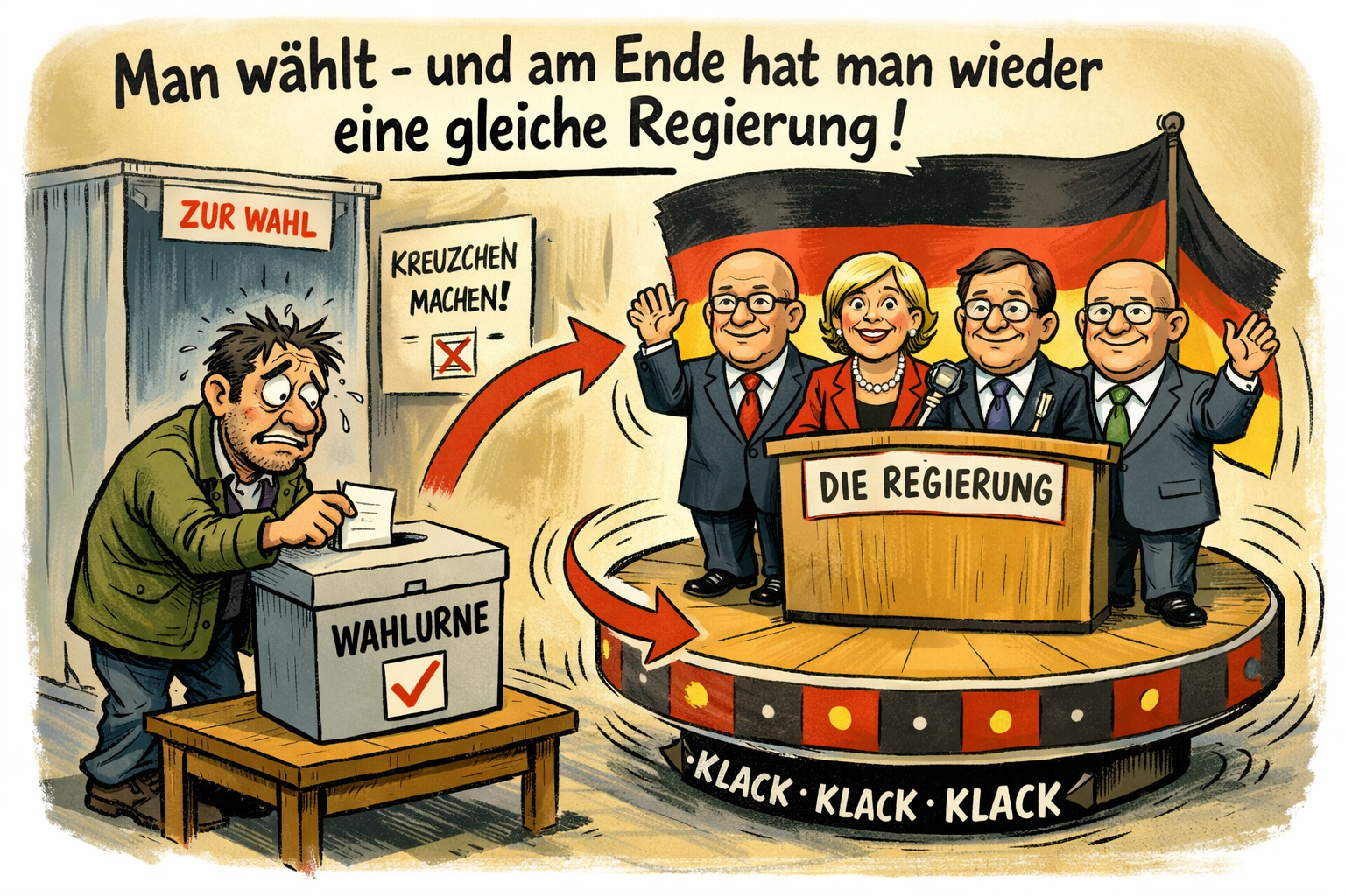 Früher, als wir noch eine funktionierende Demokratie hatten, änderte sich nach Wahlen manches in der Regierung. Heutzutage kann man wählen, was man will – danach erblickt man überrascht wieder fast dieselben Gestalten am Ruder. Es ist sehr bitter! Man könnte weiter lamentieren, aber allein das Erwähnte ist schon übergenug. Man muss kein Psychologe sein, um die Folgen einer derartigen Lage im Volk zu erraten.