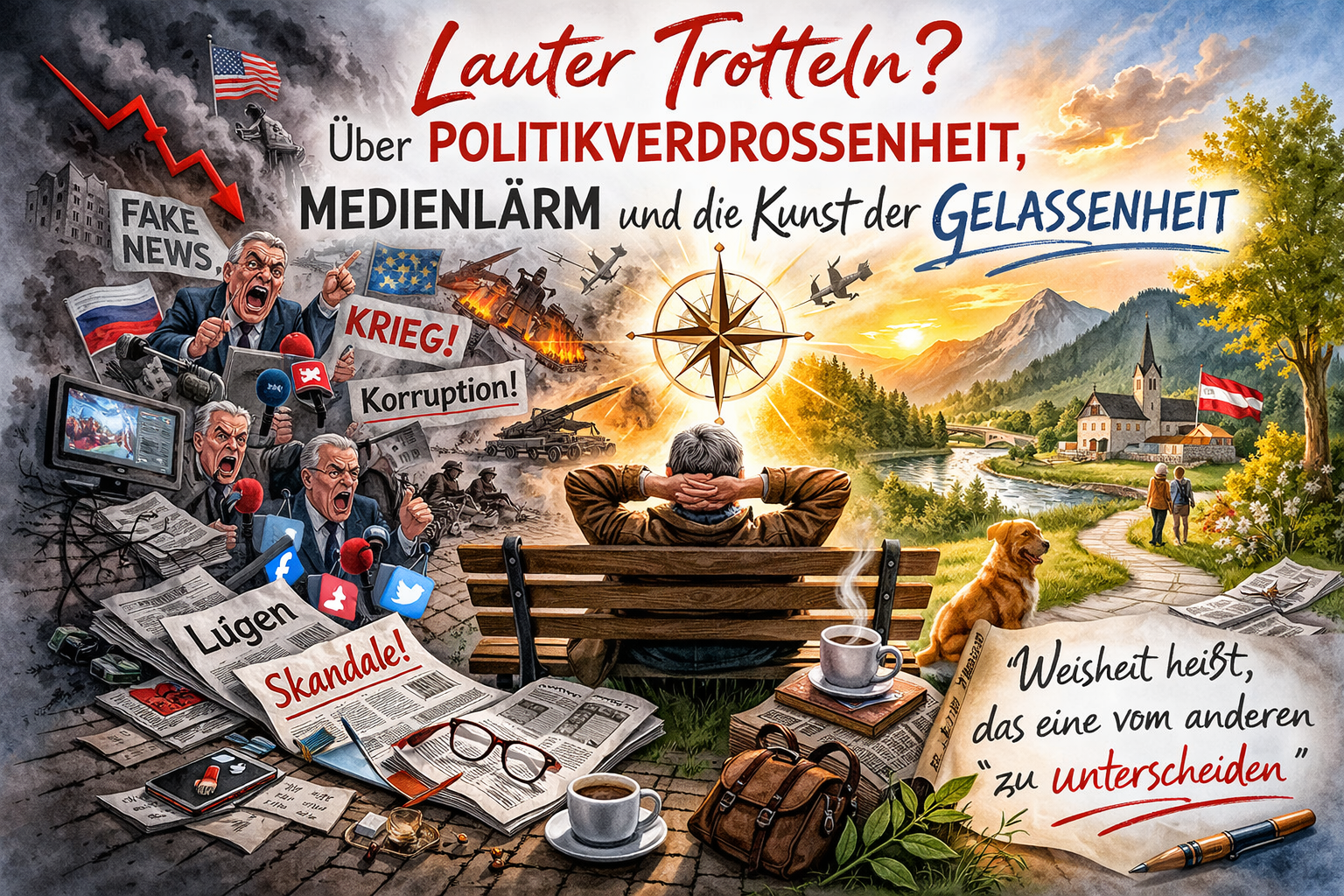 Den Kompass seiner Meinungen und Anschauungen stets aktuell einzunorden ist unerlässlich. Wenn man dabei die vielen kleinen Freuden des Lebens zu übersehen beginnt und allem Unheil dieser Welt gestattet, einen düsteren Schatten in die Seele zu werfen, sollte man aber innehalten und sich das Gelassenheitsgebot des US-amerikanischen Ethikers Reinhold Niebuhr (1892–1971) vergegenwärtigen.