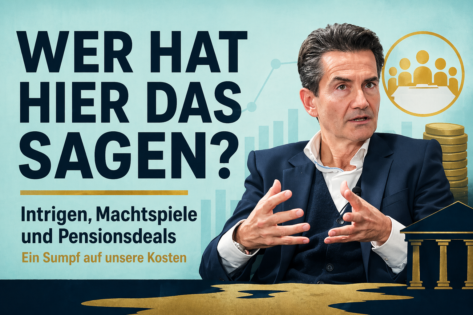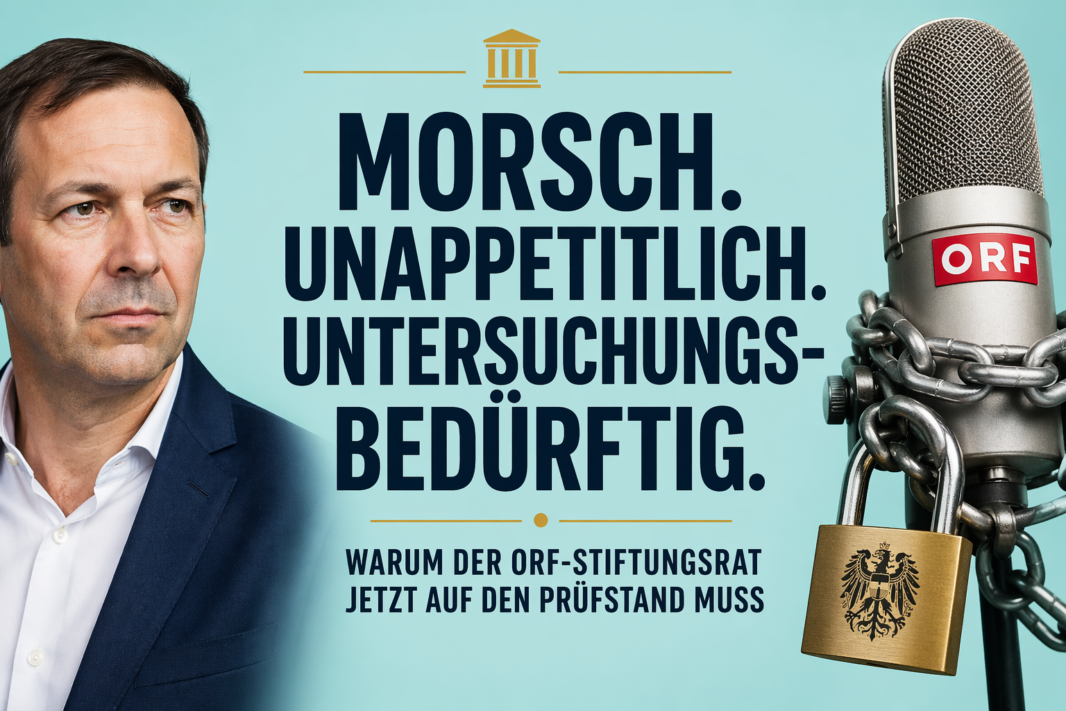 Ein Generaldirektor, Herr über ca. 4000 Mitarbeiter und zahllose Zulieferanten, der durch Mitglieder des zur Aufsicht bestimmten Stiftungsrates öffentlich vorgeführt wird, ein Aufsichtsorgan, welches sich durch Druck auf den CEO eine unverschämt hohe Pension sichern will- das ergrimmt den zwangsverpflichteten Beitragszahler. Funktionäre bessern ihre Einkünfte durch ORF-nahe Nebengeschäfte auf, in einem ekelerregenden Sumpf von Intrigen, Vernaderungen und öffentlichen Showdowns bestens verdienender Anwälten. Die Fragen „Wer hat hier das Sagen? Wer hat mehr Dreck am Stecken?“ scheinen wichtiger zu sein als das Thema: „Worin besteht der öffentliche Auftrag?“