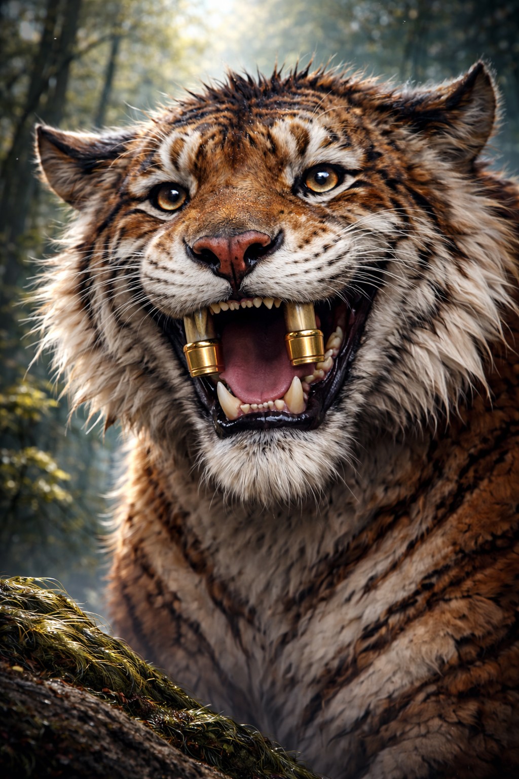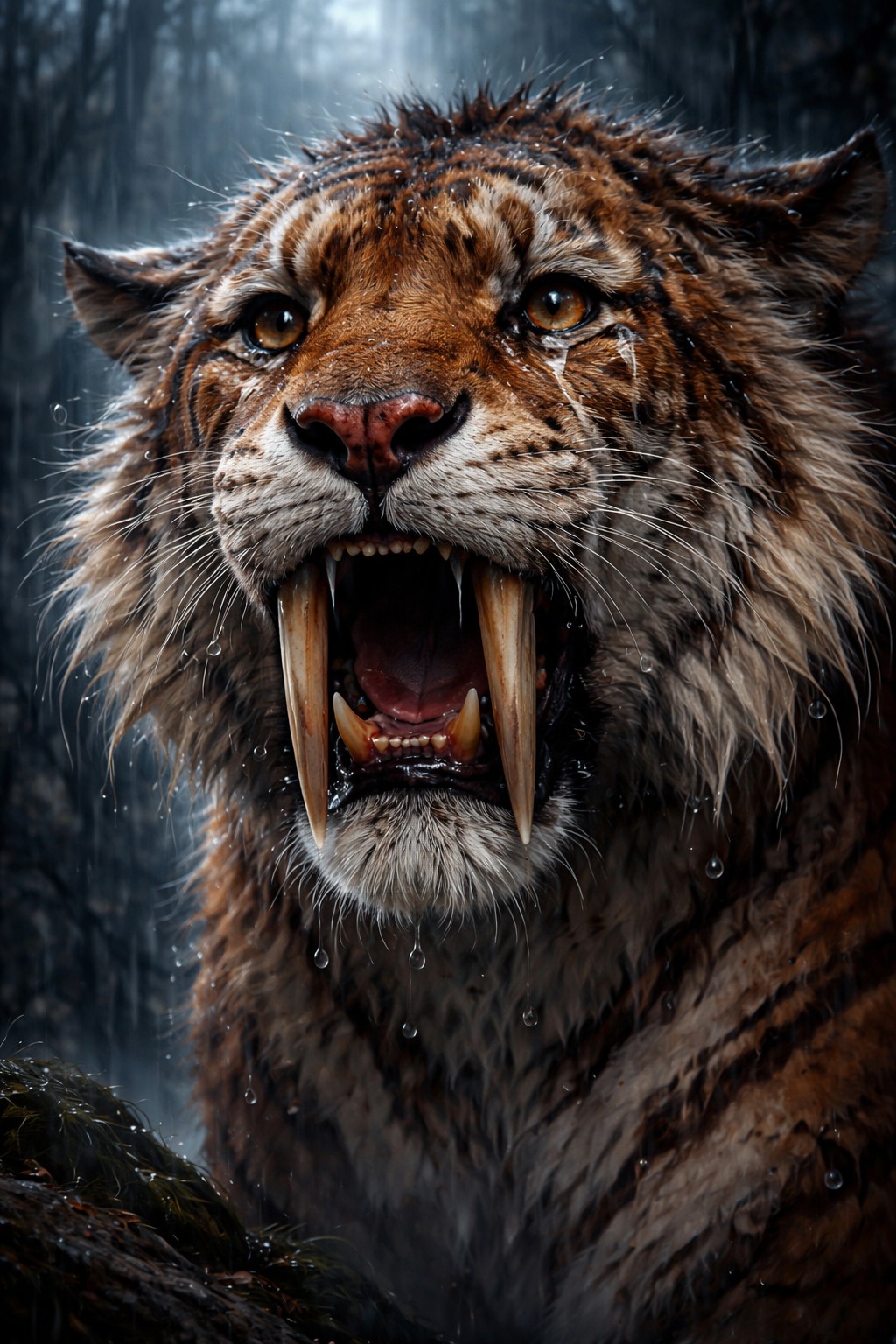 „Ich bin unglücklich“, so begann er. „Das bisherige Leben habe ich darauf verwandt, meinen Stolz, mein Glück, meine Ehre: Meine schönen, langen Eckzähne zu pflegen. Mutter, Geschwister, meine Freunde – alle haben mir eingeschärft, sie möglichst lange wachsen zu lassen, eben ein angesehener, würdiger, wahrhaft ehrfurchtgebietender Säbelzahntiger zu werden. Das habe ich getan: Beste Nahrung, Großwild, Gaumenmassage durch Rindenfressen, Waschen in den Heiligen Quellen.“
